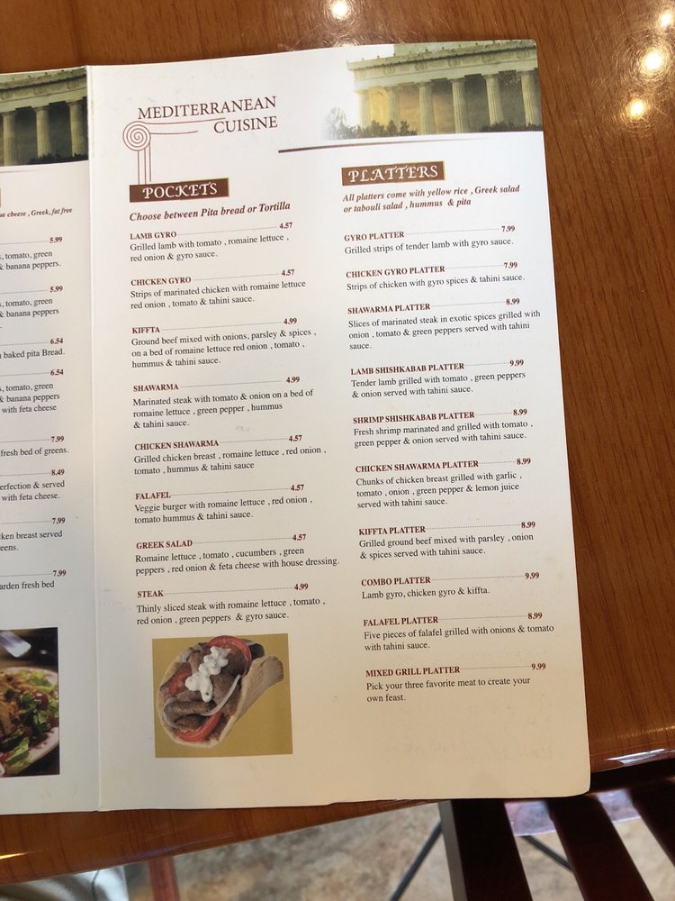 Pick 1 meat: lamb gyro, chicken gyro, shawarma, kiffta or chicken shawarma.